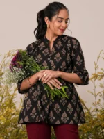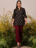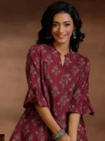 Our maroon printed cotton kurti features a mandarin notched neckline with three-quarter bell sleeves. Elevated with ethnic motifs print, this style is perfect for casual outings.