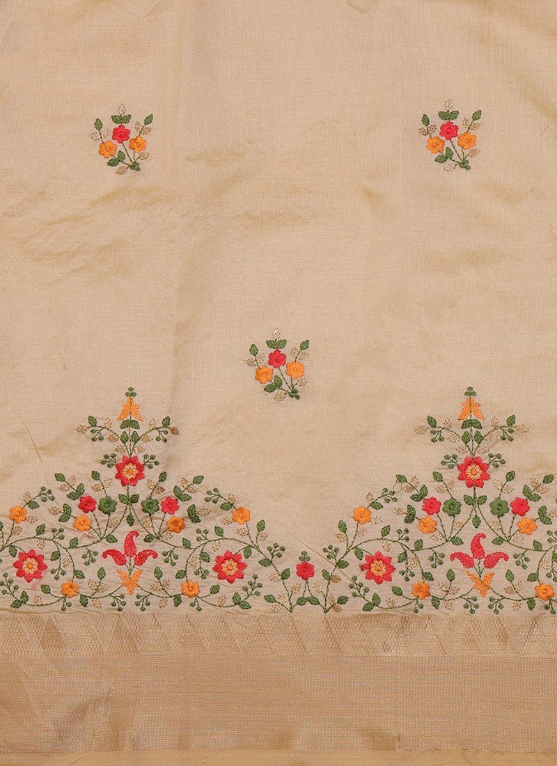 Step into elegance and grace with this exquisite white Assam Cotton Silk saree adorned with delicate small floral work and intricate thread embroidered detailing. Crafted with precision and artistry this saree exudes timeless charm and sophistication perfect for any special occasion. The fabric Assam Cotton Silk combines the lustrous sheen of silk with the lightweight comfort of cotton ensuring a luxurious drape that gracefully accentuates your silhouette. The small floral motifs scattered across the saree add a touch of femininity and allure creating a mesmerizing visual appeal. Enhancing the allure of this saree is the meticulous Thread Embroidered Work elevating its beauty to new heights. The intricate embroidery showcases the skillful craftsmanship and attention to detail making each thread a testament to timeless artistry. Adding a touch of tradition and grandeur the saree features a Temple Contrast Border exquisitely designed to capture the essence of cultural heritage. The contrast border not only adds a pop of color but also frames the saree beautifully enhancing its overall elegance. This saree is not just an ensemble its a statement piece exuding charm and sophistication making it perfect for any party or special occasion. Paired with a customized blouse tailored to perfection to complement the sarees design and enhance your unique style this ensemble promises to make you the epitome of grace and beauty. Whether youre attending a wedding a festive celebration or any grand event this saree is sure to make you stand out and leave a lasting impression. Embrace the allure of tradition and contemporary elegance with this mesmerizing white Assam Cotton Silk saree and let your style speak volumes wherever you go.
