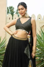 Featuring a black lehenga in a georgette base with embroidery. It is paired with an embroidered blouse having a deep V-neck and a choker dupatta. Accentuate it with statement jewellery and heels for a wedding, engagement or sangeet ceremony.
