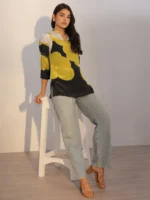 Our black printed silk blend tunic features a mandarin-notched neckline and three-quarter sleeves. Elevated with abstract prints, this style is ideal for casual outings.