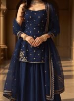 Blue Organza Sequins Moti Hand Embroidered Palazzo Suit Festive Wear