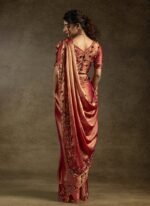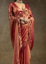 Dark Peach Satin Silk Hand Embroidered Sequins With Applique And Stone Work Saree Wedding Wear