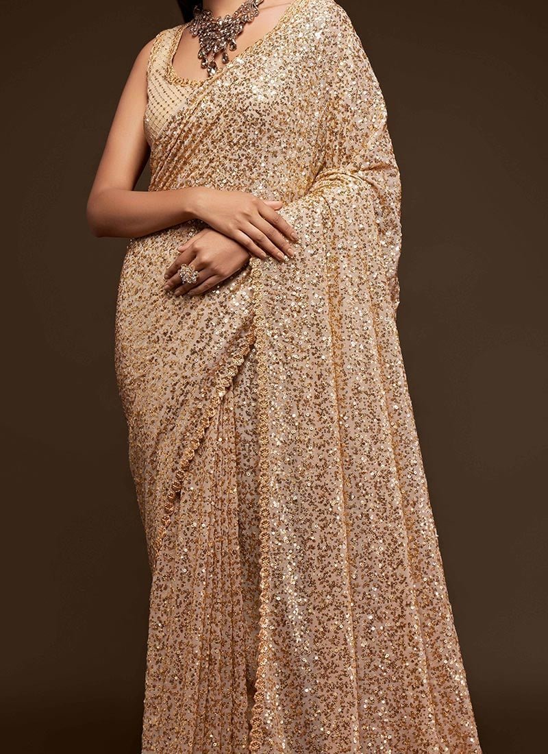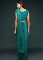 Make the heads turn whenever you dress up in this dark green color georgette saree. This saree is displaying some wonderful work done with embroidered and sequins work look chic. This saree comes with unstiched dark green color georgette blouse.