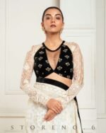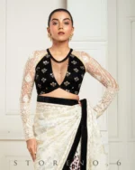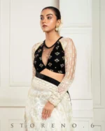 - Half And Half Full Sleeve Blouse With Zari nd Sequins Embroidered Black Velvet and Off-White Thread and Sequins Embroidered Net.