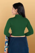 Elevate your ethnic style with this elegant high-neck cropped blouse, designed to pair perfectly with sarees, lehengas, and skirts. Crafted from soft, stretchable fabric, this blouse offersa snug yet comfortable fit that enhances your silhouette. The full sleeves and modern high neckline add a contemporary touch while maintaining a classy ethnic appeal. Ideal for festive occasions, parties, office wear, and casual ethnicstyling, this versatile blouse is a must-have wardrobe essential. The smooth finish and rich, solid color make it easyto mix and match with printed or plain sarees. Note: Sareeshown in images is for styling purposes only and is not included.