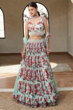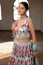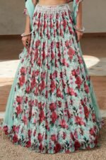 Featuring a green lehenga in viscose organza base with floral print. It is paired with a blouse having pearl work and a soft net dupatta. Accentuate it with statement earrings and heels for mehendi or engagement ceremonies.