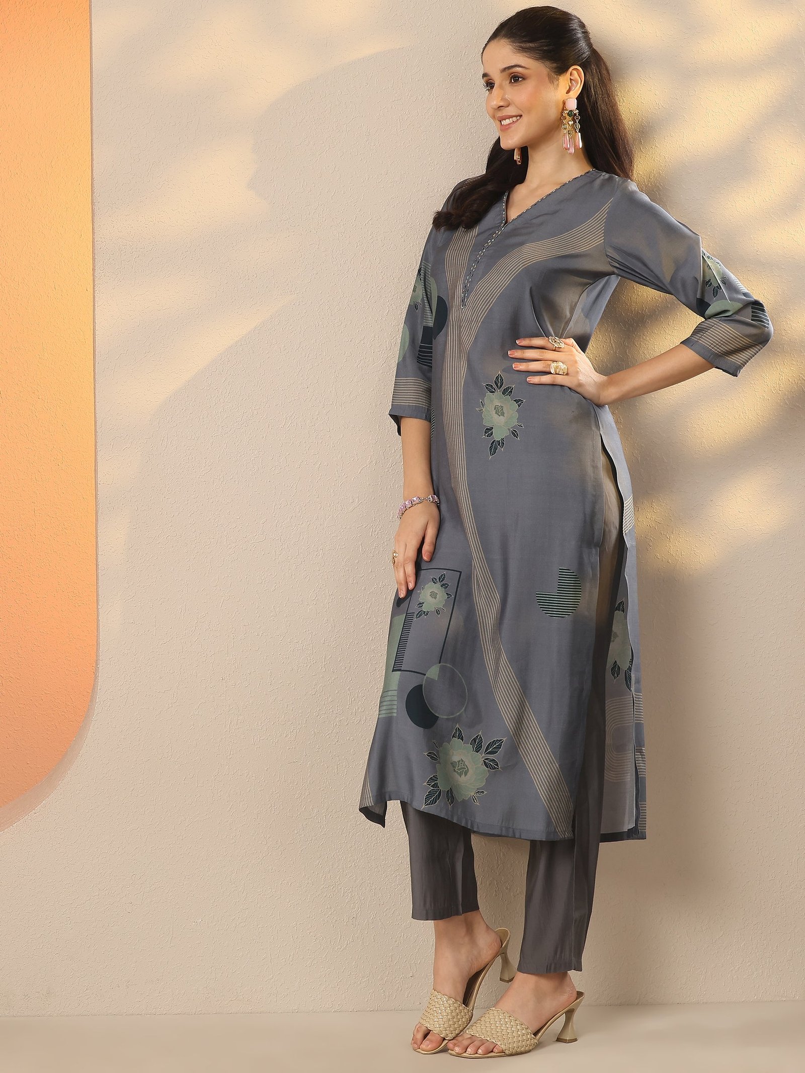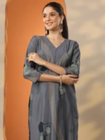 Grey Printed Silk Blend Straight Kurta