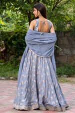 Featuring a grey lehenga in upada silk base butterfly detailing. It is paired with a blouse and an organza dupatta. Accentuate with chandbali earrings and heels for an engagement ceremony or a festive occasion.