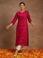 Hot Pink Embroidered Chanderi Silk Straight Kurta