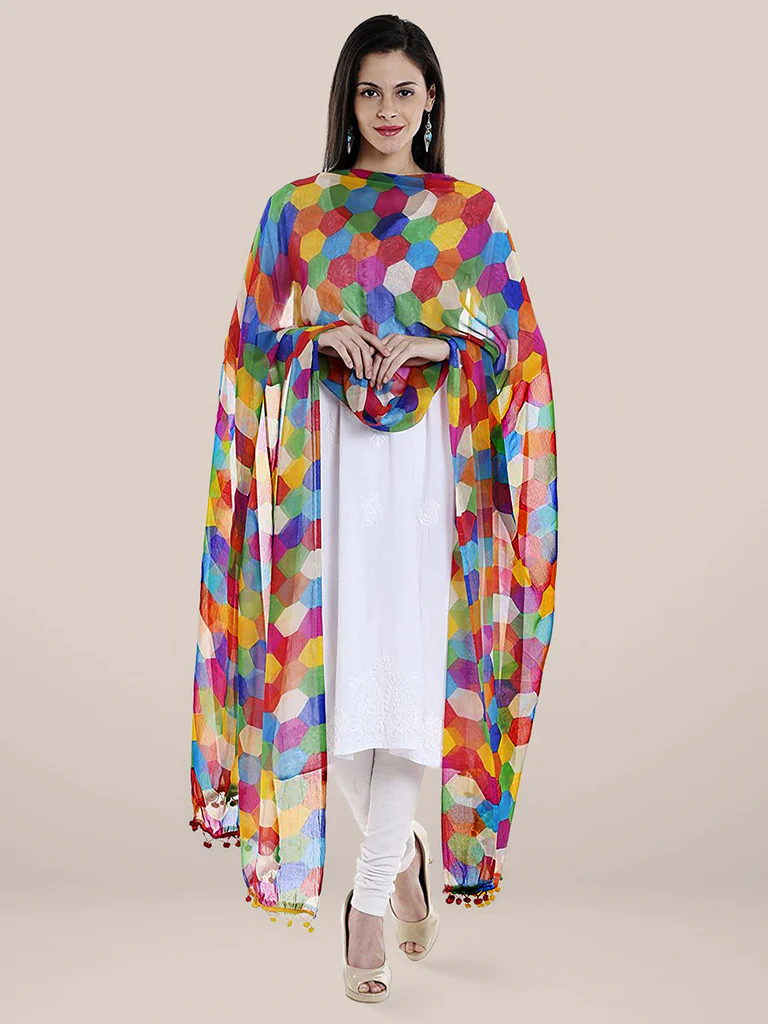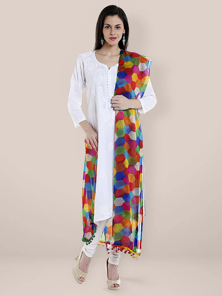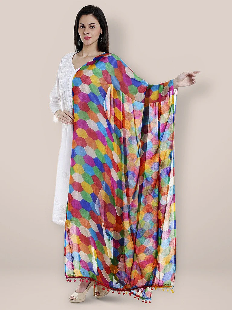 Add a splash of vibrancy to your wardrobe with this exquisite piece of printed multicoloured chiffon Dupatta. Swathed with a cheerful print and colourful pom poms, this stunner is a must in your collection. Drape it around a solid coloured kurta to give a touch of charismatic splendour to your ethnic diva look!.