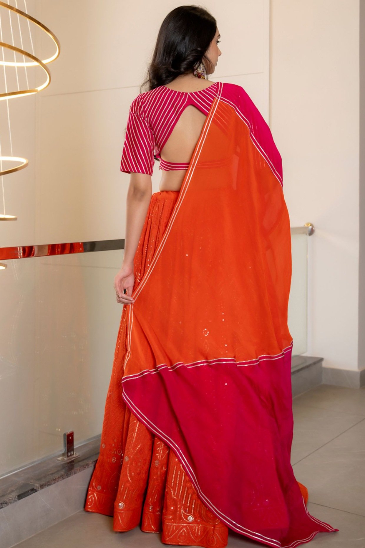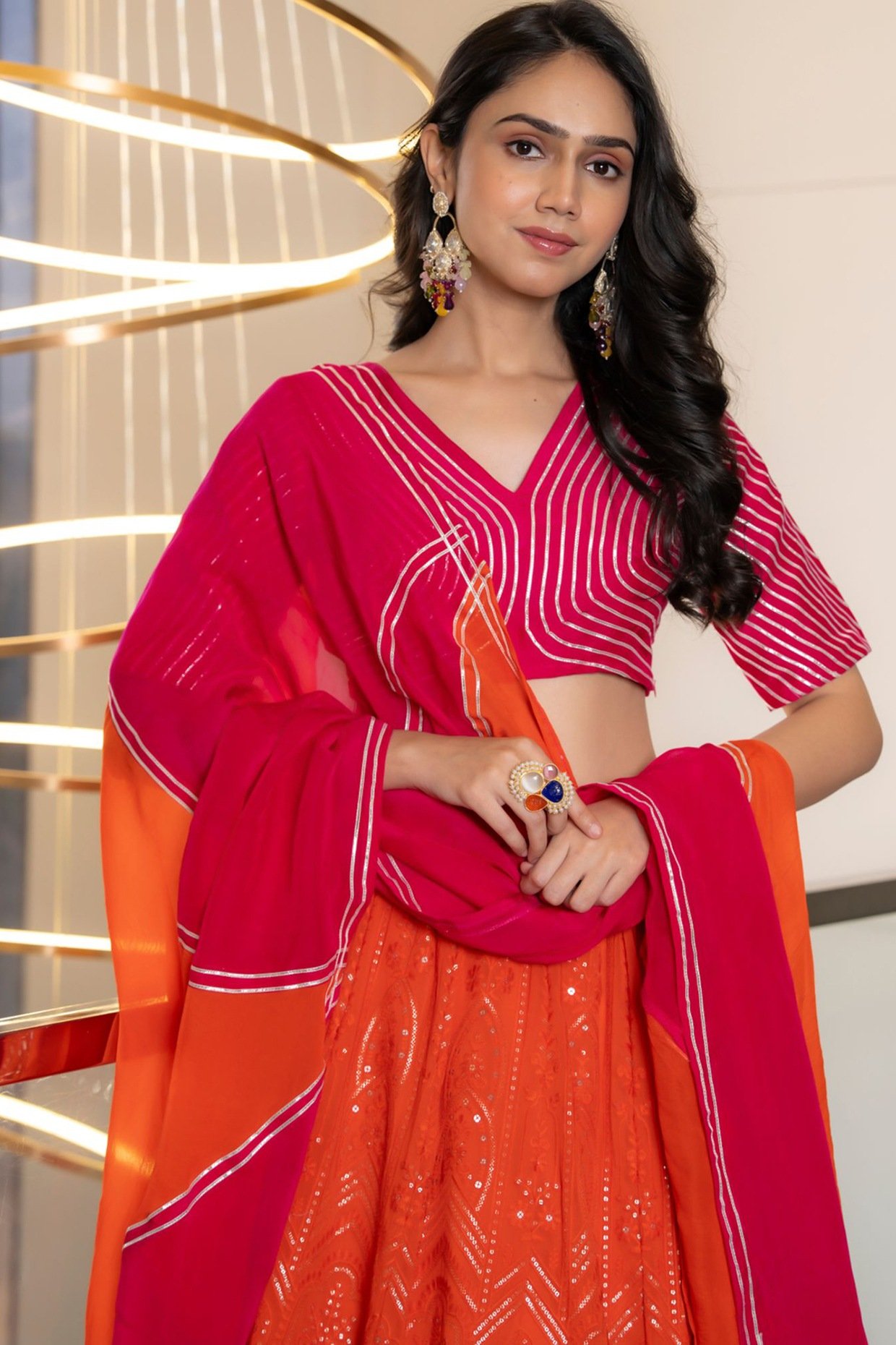 Featuring an orange lehenga in muslin organza base with embellishments. It is paired with a pink blouse having silver details and an orange dupatta. Accentuate it with dangler earrings and heels for festive occasions or wedding ceremonies.