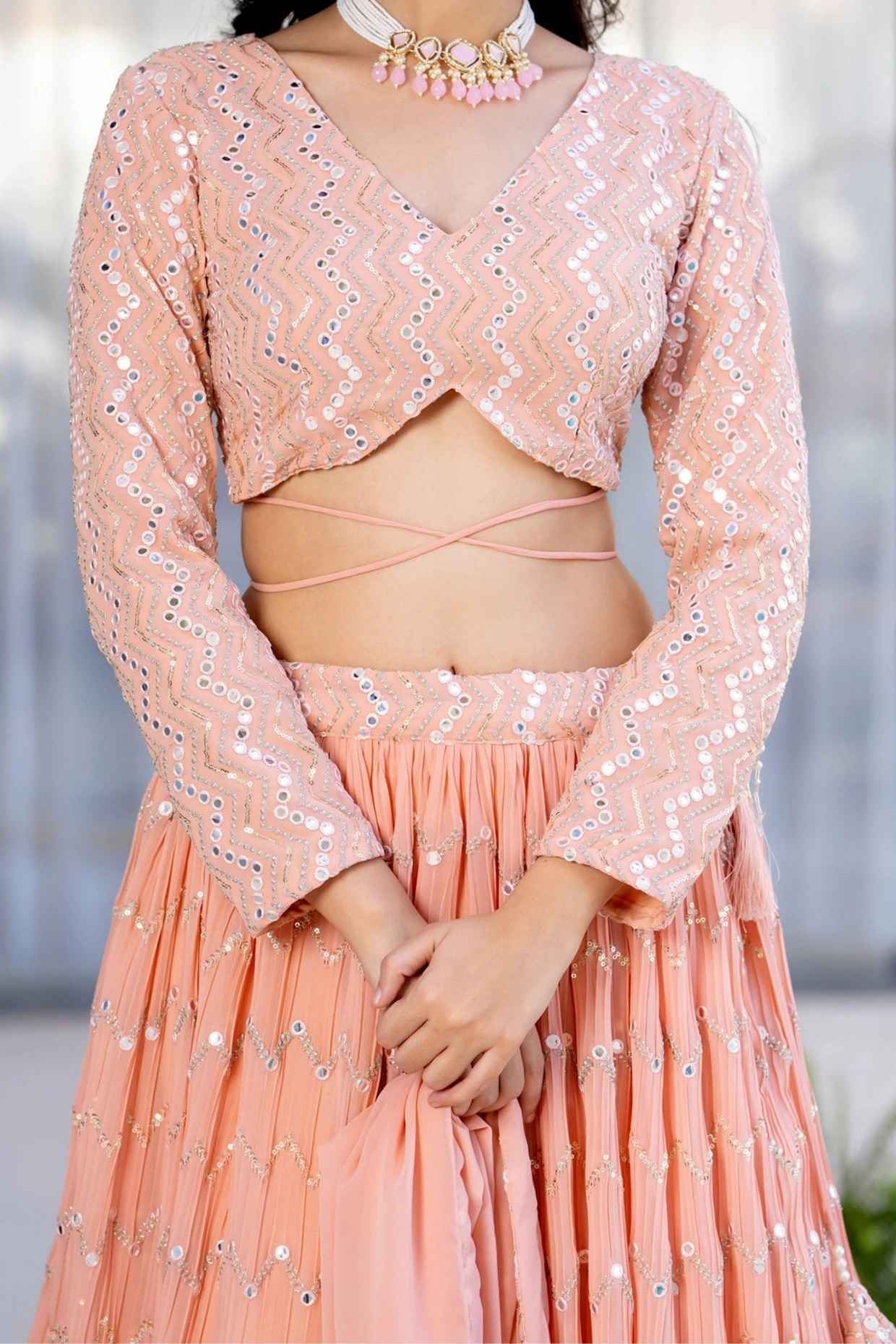 Featuring a peach lehenga in georgette base with latkans and mirror work. It is paired with a blouse and a dupatta. Accentuate it with dangler earrings and heels for festive occasions or wedding ceremonies.