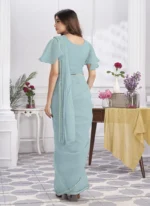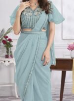 • The Powder Blue Faux Georgette Embroidered Sequins PreDraped Elegant Saree with its matching blouse and waist band is a harmonious blend of tradition and modernity. Its exquisite design comfortable fabric and versatile style make it a perfect choice for various occasions ensuring that you look and feel your best whether youre attending a cocktail party a festive gathering or a sangeet.