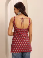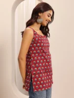 Our 1-piece red cotton straight-fit features a strappy neckline and a statement Yoke. Adorned with floral print, this style is perfect for casual wear.