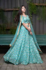 Looking for an authentic Lehenga? Then buy the Ice Blue Sequin and Zari Work Lehenga Choli Set Online in India. It is a set of three, which includes a stitched blouse (non-padded) with a zip, a lehenga and a dupatta. We provide a blouse with all-over golden sequins and zari work with a tie-up at the back. The Lehenga comes featuring golden sequin work all over with a drawstring waist, and the dupatta comes in exact match with the set, with zari lace matching the lehenga on all sides. Buy our Ice Blue Sequin and Zari Work Lehenga Choli Set Online in India, as it is a suitable outfit to mark a signature presence at any party or occasion. The finished look of the outfit is just apt for styling with elegance.