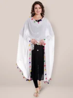 Add a touch of elegance to your wardrobe with this exquisite piece of beautiful chiffon Dupatta. Swathed with charming colourful pompom balls, this stunner is a must in your collection. Drape it around a solid or printed kurta, kurti, top or a skirt to give a touch of charismatic splendour to your ethnic diva look!