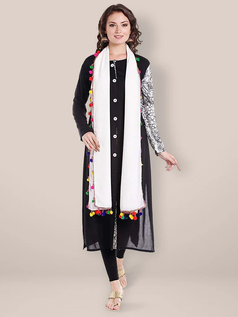 Home Dupatta White Chiffon Dupatta with Multicolored Pompom Balls