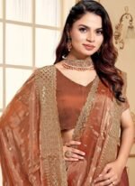 The Rust Zari Embroidered Sequins Saree is a stunning ensemble that perfectly blends elegance and craftsmanship. This saree is designed to make a bold statement with its luxurious Rust fabric enhanced by intricate zari embroidery and shimmering sequins. The combination of Rust with golden zari work creates a striking contrast, making this saree a showstopper for any grand occasion. The embroidery follows traditional patterns seamlessly blending with the modern sequins detailing, which adds a touch of contemporary sophistication to the attire. The saree drapes gracefully, exuding a timeless charm that complements various body types.