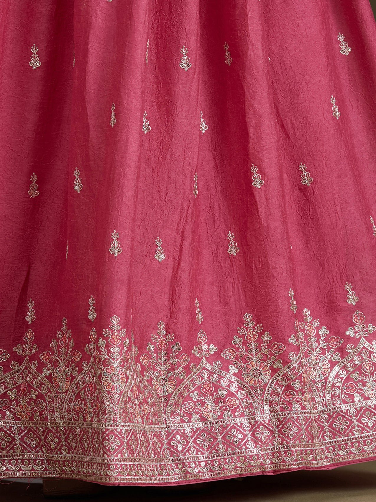 Readymade Lehenga in Soft Raw Silk fabric. The Lehenga is embellished with Zariwork (Silver) embroidery. Accompanied with an Readymade blouse and dupatta. Comes with the Koskii promise of premium quality.